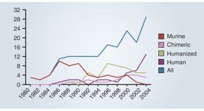 • Fully human monoclonal antibodies (mAbs), which have the potential to be less immunogenic than earlier humanized and chimeric mAbs, are the most rapidly growing class of mAbs in clinical development. Here, Reichert and colleagues highlight trends in the development of human mAbs, seven of which have so far gained regulatory approval.