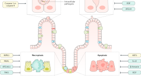 Evidence points to a crucial role of necroptosis and pyroptosis as important modes of programmed cell death in the intestine in addition to apoptosis. This Review discusses advances in our understanding of apoptosis, necroptosis and pyroptosis as major cell death pathways that can result in pathophysiological outcomes.