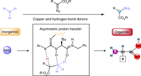 The use of ammonia as a nitrogen source in catalytic asymmetric reactions is attractive but represents a difficult exercise. Now, the asymmetric synthesis of N-unprotected α-amino esters from α-diazoesters and ammonia is achieved by cooperative action of copper complexes and chiral hydrogen-bond donors.