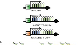 Pei-Shi Yen et al. report a strategy for engineering transgenic Aedes aegypti mosquitoes to express antiviral miRNAs that simultaneously target two distinct arboviruses, dengue and chikungunya. The strategy results in reduced viral transmission in the mosquito saliva following an infected bloodmeal.