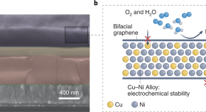 The instability of the rear electrodes in perovskite solar cells limits the long-term durability of the devices. Now, researchers have developed a composite electrode consisting of Cu–Ni alloy sandwiched between graphene layers to considerably improve the operational stability of perovskite solar cells.