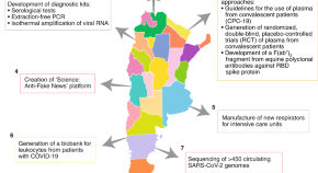 From the onset of the SARS-CoV-2 pandemic and following the creation of the ‘Coronavirus Unit’, Argentinean scientists and technologists have contributed by leading basic and translational research initiatives, including developing diagnostic and serological kits, designing new therapeutic approaches, establishing epidemiological platforms, executing clinical trials and implementing social measures to protect the most vulnerable groups of the population.