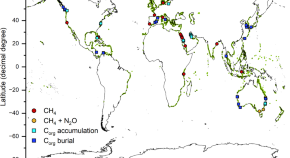 The authors show that estuarine and coastal vegetation are collectively a greenhouse gas (GHG) sink for the atmosphere, but methane and nitrous oxide emissions counteract the carbon dioxide uptake. Critical coastal GHG sink hotspots are identified in Southeast Asia, North America and Africa.