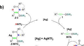 Silver-catalyzed hydroamidation of siloxy-alkynes is a successful approach for the hydroamidation of internal alkynes, however the mechanism of this reaction is poorly understood. Here, the authors use density functional theory calculations to reveal that the reaction takes place through a silver activated silylium ion migration mediated hydroamidation pathway.