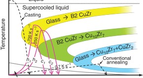 Metallic glasses (MG) have higher yield strengths than crystalline alloys but at the same time are very brittle, which has hampered practical applications. Here, the authors use flash Joule heating to design a MG-matrix composite with a uniform distribution of ductile crystals, improving mechanical properties.