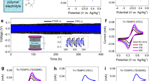 Nonaqueous redox flow batteries face challenges like costly membranes and unstable electrolytes. Here, authors develop a membrane-free battery using a polypropylene carbonate gel polymer electrolyte with Li anode and Tri-TEMPO catholyte, achieving a high voltage of 3.45 V, capacity retention of 96.8%, and efficiency of 98.4%.