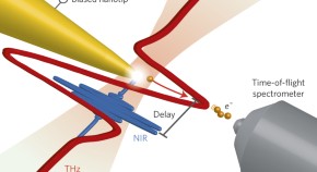 Nanoscale metallic tips are a useful source of electrons for material characterization. It is now shown how terahertz radiation can provide precision control and enhancement of photoelectron emission from these sources. The approach can shape the spectrum of the electron pulse, which could pave the way to improvements in ultrafast electron diffraction and transmission electron microscopy.