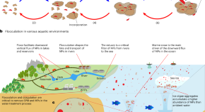 Microplastics dispersed in the environment can be transported as single entities or in flocs. Analysis of existing and new data shows that microplastic transport can be modelled in a way that is consistent with a predominance of floc movement.