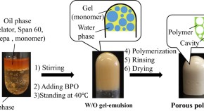 Water-in-oil (W/O) gel-emulsions consisting of water and a monomer were successfully prepared using N-3-hydroxypropylcarbonyl-L-isoleucyl-aminooctadecane as a gelator. Low-temperature polymerization of the gel-emulsions with a redox initiator was performed to obtain the corresponding porous polymers. Polymerization of gel-emulsions containing bifunctional monomers gave crosslinked porous polymers, which were found to be mechanically robust and solvent resistant. The adsorption capacities of the polymers toward several liquids were assessed and rationalized in terms of the surface microstructures of the polymers. The time courses of the adsorptions were investigated, revealing a two-step adsorption process comprising rapid permeation into the cavities of the porous polymers followed by a slow swelling step.