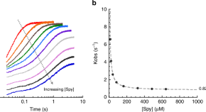 • Spy is an ATP independent chaperone that allows folding of its client protein Im7 while continuously bound to Spy. Here the authors employ kinetics measurements to study the folding of another Spy client protein SH3 and find that Spy’s ability to allow a client to fold while bound is inversely related to how strongly it interacts with that client.