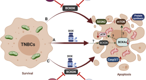 Proposed mechanism. A Doxorubicin (DOX) targets the BCAA catabolic pathway in TNBCs, by downregulating BCKDK and augmenting clearance of intracellular BCKAs. B Genetic or pharmacological (high BT2 concentration) inhibition of BCKDK results in increased cell death, decreased intracellular BCKAs, dysregulated mitochondrial function, ATP insufficiency, SESN2 activation, and inhibition of mTORC1 signaling and protein synthesis. C BCKDK inhibition (siRNA mediated or low-BT2 concentration) exacerbates DOX-induced cytotoxicity and caspase activity.