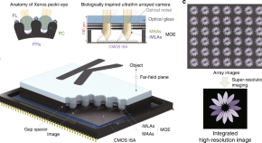 An imaging device inspired by insect stereopsis allows for simultaneous near-distance microscopic imaging, high speed imaging at far distance and 3D depth imaging at intermediate distances. The camera, reported by Kisoo Kim and colleagues, gives clues as to how insects see the world and offers insights for designing compact cameras with multifunctional capabilities.