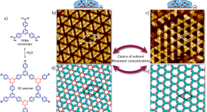 • The strong electric field between the tip of a scanning tunneling microscope and graphite has been used to modulate the two-dimensional polymerization of aryl boronic acids. Here, the authors study the influence of solvent choice and monomer concentration on the electric field-mediated polymerization and depolymerization of a boroxine-based 2D polymer on graphite.