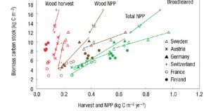 European forests are intensively exploited for wood products, yet they are also a potential sink for carbon. European forest inventories combined with timber harvest statistics from sixteen European countries show that between 1950 and 2000 forest biomass increased faster than the amount of timber harvests. Silviculture, which has developed over the past 50 years, can efficiently sequester carbon on timescales of decades, while maintaining forests that meet the demand for wood.