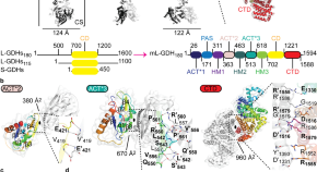 Lázaro et. al. report the first 3D structure of a large glutamate dehydrogenase (L-GDH), the one corresponding to the Mycobacterium smegmatis enzyme composed of 180 kDa subunits (mL-GDH180), obtained by X-ray crystallography and cryo-electron microscopy. This structure reveals that mL-GDH180 assembles as tetramers with the N- and C-terminal domains being involved in inter-subunit contacts and unveils unique features of the subfamily of L-GDHs.