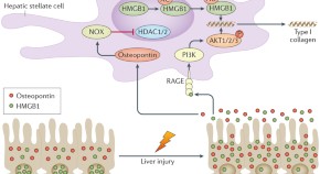 Liver fibrosis, the accumulation of extracellular matrix proteins caused by chronic liver damage, results from the activation of hepatic stellate cells. In a new study, Arriazu et al. explore in detail the mechanisms by which the multifunctional protein osteopontin drives hepatic fibrosis, and show that interaction with HMGB1 mediates the fibrogenic response.