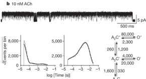 The acetylcholine receptor, which mediates rapid synaptic transmission, possesses two agonist binding sites, the occupation of which leads to channel opening; however, the precise molecular events that follow agonist binding are unclear. Here, the receptors are locked in conformations equivalent to agonist-bound states, and it is observed that each binding site initiates the formation of one of two 'primed' states from which the channels are able to open and close.
