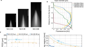 The authors demonstrate that optical fibers with tapered tips can homogenously illuminate either elongated brain structures or dynamically selected subregions. Tapered fibers achieve efficient optogenetic stimulation in vivo with minimal tissue damage. In addition, a single fiber can deliver light of multiple wavelengths to independently controlled regions.
