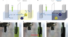 • The polyoxoanion [P2W18O62]6− has been shown to reversibly accept up to 18 electrons upon reduction in aqueous solution. The resulting highly reduced solution can then be used either for the on-demand generation of hydrogen over a catalyst bed, or as a high-energy-density electrolyte in a redox flow battery.