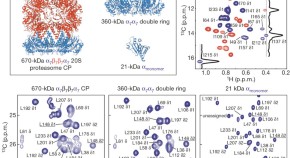 • By overcoming the molecular weight limitations that have traditionally hampered quantitative nuclear magnetic resonance spectroscopy (NMR) studies, the dynamics of the 670-kilodalton 20S proteasome core particle have been explored. A selective isotope labelling scheme along with experiments that preserve the lifetimes of the resulting NMR signals reveal functionally important motions and interactions by recording spectra on complexes with molecular weights up to 1 MDa.