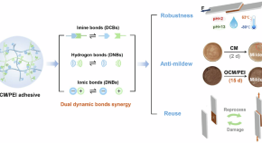 A reusable camellia meal-based adhesive with reliability and responsiveness is designed by leveraging the cooperation of dynamic covalent bonds (DCBs) and dynamic noncovalent bonds (DNBs). These dual dynamic bonds synergy strategy allows the resulting adhesive with a much-improved and multi-purposed adhesion properties (2.1/1.06 MPa to wood in dry/wet condition) and remarkable adhesion maintenance against harsh environmental factors (organic solvents, salt, acid, alkali, temperature, soaking time). With the assistance of synergistic dynamic network, our adhesive also possesses enhanced mildew resistance and reusable adhesion, contributing to break the inherent limitation in biomaterials.
