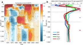 Greenhouse gas forcing has increased ocean heat content, with large impacts on the Earth system. This Review outlines observed and projected global and regional changes, revealing an observed 0–2,000 m global increase of 351.4 ± 59.8 ZJ from 1958 to 2019, and a projected increase of 1,874 [1,637–2,109] ZJ by 2100 under SSP5-8.5.
