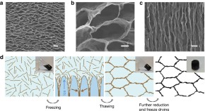 The exploitation of the properties of graphene, such as mechanical strength and electrical conductivity, in deformable macroscopic materials is desirable. Here, a combination of graphene chemistry and ice physics is used to fabricate biomimetic, ultralight and superelastic graphene cellular monoliths.