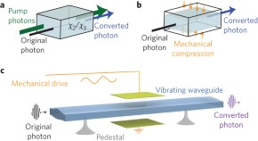 An optomechanical single-photon frequency shifter is demonstrated in integrated AlN waveguides. A frequency shift up to 150 GHz is achieved at telecom wavelength. The device shows near-unity efficiency and preserves the quantum coherence.