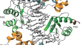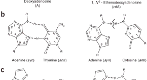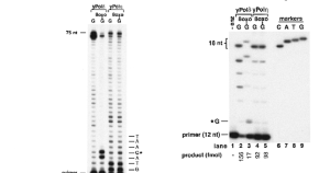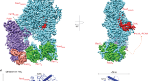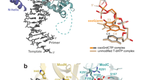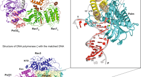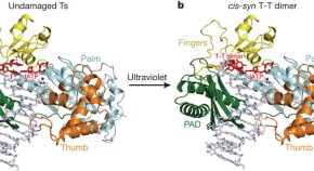 Ultraviolet radiation causes damage to DNA in skin cells, blocking DNA replication and causing mutations that can lead to cancer. One way in which the cell deals with such damage involves specialized DNA polymerases, such as Polη, that can bypass lesions. Here the crystal structure is presented of Pol? in complex with a thymine–thymine dimer and with undamaged DNA. The bulky thymine dimer is accommodated in an atypically large active site, and stabilized by interactions not found in other polymerases.