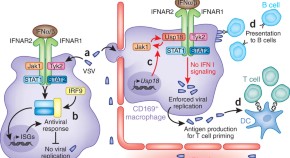 Lifting the protective shield provided by the type I interferon system selectively in CD169+ splenic macrophages enforces localized viral replication. Such controlled release of virus amplifies adaptive antiviral immune responses.