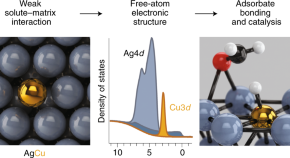In solid metals, electron orbitals form broad bands and their binding of adsorbates depends on the bandwidth. Now, it is shown that a weak solute–matrix interaction in dilute alloys results in extremely narrow electronic bands on the solute, similar to a free-atom electronic structure. This structure affords unique adsorption properties important for catalysis.