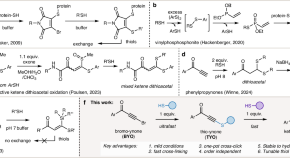 The direct cross-coupling of two thiols is an attractive biomimetic concept for click chemistry, but leads to statistical mixtures of homo- and heterodimers. Here, the authors introduce a class of thiol-click reagents, bromo-ynones, where the kinetic differentiation between the first and second thiol addition onto these reagents facilitates a stepwise one-pot “cross-clicking” of two distinct thiols in aqueous media, without the need for intermediate isolation or purification.