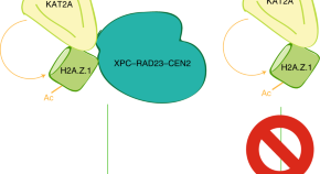 KAT2A acetylates histone variant H2A.Z to regulate transactivation of XPC and RAR positively regulated genes. The DNA repair complex XPC–RAD23–CEN2 interacts with H2A.Z and KAT2A to license the latter’s histone acetyltransferase activity.