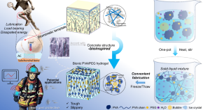 • Hydrogels have potential in a number of applications, but for many, mechanical robustness is required. Here, the authors report the preparation of a PVA/PEG hydrogel with a cartilage-inspired structure, with high compressive strength and low coefficient of friction, amongst other properties.