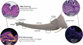 Advanced microscopy shows that the skin along the elephant’s trunk is anisotropic; elephant skin has an armor thicker than an Armadillo shell, with entangled protein fibers that provide additional stiffness.
