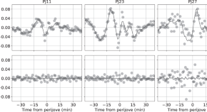 Juno spacecraft experienced unknown accelerations near the closest approach to Jupiter. Here, the authors show that Jupiter’s axially symmetric, north-south asymmetric gravity field measured by Juno is perturbed by a time-variable component, associated to internal oscillations.