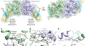 Dynamin is a protein that catalyses the fission of clathrin-coated endocytic vesicles from cellular membranes. To carry out fission, it must hydrolyse GTP. The mechanism by which it does so is unknown, although it does require dynamin's GTPase effector domain (GED). Here, the structure of a minimal GTPase–GED fusion protein constructed from human dynamin 1 is presented. The structure reveals the catalytic machinery and provides new insight into the mechanisms underlying dynamin-catalysed membrane fission.