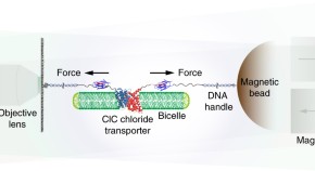 • A single-molecule forced unfolding of E. coli chloride transporter ClC-ec1 shows that the N- and C-terminal halves of the protein unfold independently, with exposed polar surfaces stabilized by membrane lipid head groups and water.