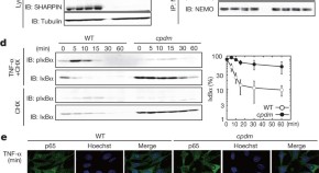 The ubiquitin conjugation system regulates the canonical NF-κB-activation pathway, which mediates immune responses. Linear polyubiquitin chains—in which the C-terminal glycine of ubiquitin is conjugated to the α-amino group of the amino-terminal methionine of another ubiquitin—are generated by a unique ubiquitin ligase complex called linear ubiquitin chain assembly complex (LUBAC) composed of two RING domain proteins called HOIL-1 and HOIP. This is one of three complementary studies identifying a novel component of the LUBAC complex called SHARPIN, which is recruited to receptor signalling complexes (RSCs) that form after TNF and CD40L stimulation. The LUBAC complex containing SHARPIN stimulates the formation of linear ubiquitin chains in vitro and in vivo and is required for the activation of NF-κB signalling.