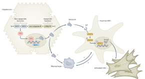 In this issue of Nature Metabolism, Wang et al. identified a non-apoptotic caspase-8 function in metabolic dysfunction-associated steatohepatitis (MASH), in which hepatocyte-derived caspase-8 induces meteorin, which in turn activates hepatic stellate cells (HSCs) to drive fibrosis. This function reveals a potential therapeutic target to directly address fibrosis and reduce the progression of metabolic dysfunction-associated steatotic liver disease (MASLD).