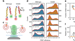 Georg Krainer and Antoine Treff et al. use a helical-hairpin construct derived from the cystic fibrosis transmembrane conductance regulator (CFTR) to investigate misfolding caused by the disease-linked V232D mutation. Using single-molecule FRET, they show that the V232D hairpin assumes an open conformation in lipid bilayers, which is reversed by the pharmacological corrector Lumacaftor.