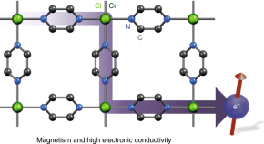 Achieving high conductivity in metal-organic solids can be challenging, due to the difficulty of obtaining a good overlap between the d-orbitals of the metal and the π-orbitals of the organic molecule. Here, the authors present two coordination solids, VCl2(pyrazine)2 and TiCl2(pyrazine)2, with remarkably different electrical conductivity. While the former is an insulator, the latter displays the highest conductivity of any octahedrally coordinated metal ions based metal-organic solid.