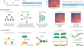 Machine learning can be applied for the controlled synthesis of nanoparticles with precise properties. This Review discusses different machine learning approaches for the synthesis of semiconductor, metal, carbon-based and polymeric nanoparticles, and highlights key approaches for the collection of large datasets.