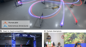 • An autonomous system is described that combines deep reinforcement learning with onboard sensors collecting data from the physical world, enabling it to fly faster than human world champion drone pilots around a race track.