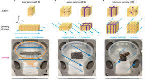• An untethered jamming mechanism uses magnetic fields to control interactions between soft-ferromagnetic composites with designed magnetization profiles. Stiffness, damping, and shapelocking are tuned for programmable robotic materials.