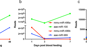 Perdomo et al. fed mosquitos (Aedes aegypti) a diet spiked with human blood miRNA, hsa-miR-21-5p and used proteomics analysis to show differential protein expression in female Ae. aegypti mosquitoes after feeding. They showed that hsa-miR-21-5p positively regulated vitellogenin, which plays a role in egg production, thus could have effects on Ae. aegypti progeny production.