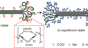 Polyelectrolytes (PEs) with high water uptake prepared from cellulose-type polysaccharides are promising because of their excellent biodegradability. In this work, utilizing a two-step selective oxidation process a new type dicarboxylate nanocrystalline cellulose (DCNC) PE was prepared. Carboxylate units were introduced at the C-2 and C-3 positions of a glucose moiety to ensure the presence of a large number of dissociable electrolytic ions. It was observed that the equilibrium water uptake capacity of the prepared DCNC was almost ten times greater than that of conventional C-6 functionalized monocarboxylated nanocrystalline cellulose.