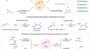 Functionalization of 1,3-enyne represent a powerful method to construct allenyl- and propargylderivatives, but hydrosilylation reaction of 1,3-enynes remains underdeveloped. Here, the authors report a copper-catalyzed ligand-controlled selective 1,2- and 1,4- hydrosilylation of 1,3-enynes which proceeds enantioselectively with high yields.
