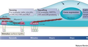 Cells grown on a stiff substrate are stimulated through physical cues to spread, create actin stress fibres and proliferate. Here Cui et al. show that cyclic stretching cells on a soft pillar substrate has the same effect as growth on a stiff substrate, and results in nuclear translocation of YAP and MRTF-A.