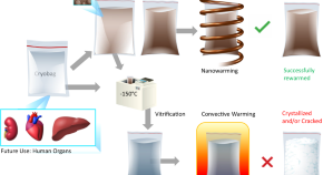 • Organ banking via vitrification could transform transplantation but has never been achieved at human organ scales. Here, the authors demonstrated successful vitrification in ≤ 3L CPA volumes and ~<1L porcine liver with successfully rewarming ≤ 2L CPA volumes using nanowarming.